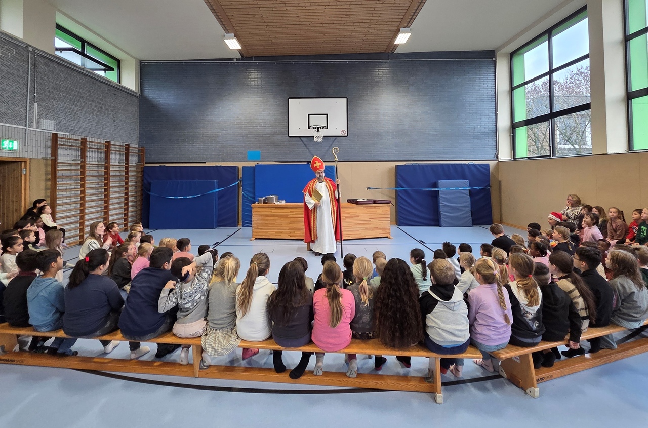 Nach einem sicherlich vollgepackten Nikolauswochenende hat es sich der Nikolaus nicht nehmen lassen, am heutigen Montag auch die Kinder der Overbergschule noch einmal persönlich zu besuchen. In unserer Sporthalle wurde er zunächst von den Kindern der 1./2. Klassen herzlich empfangen bis er dann anschließend auch von unseren Dritt- und Viertklässlern begrüßt wurde. Viele Klassen hatten auch ein kleines Lied für den Nikolaus vorbereitet, so dass dieser nicht nur alleine erzählen, sondern auch selbst ein bisschen lauschen durfte. Anschließend gab es für die Kinder noch frisch gebackene Nikolausplätzchen und eine weihnachtliche Grußkarte vom Nikolaus.
